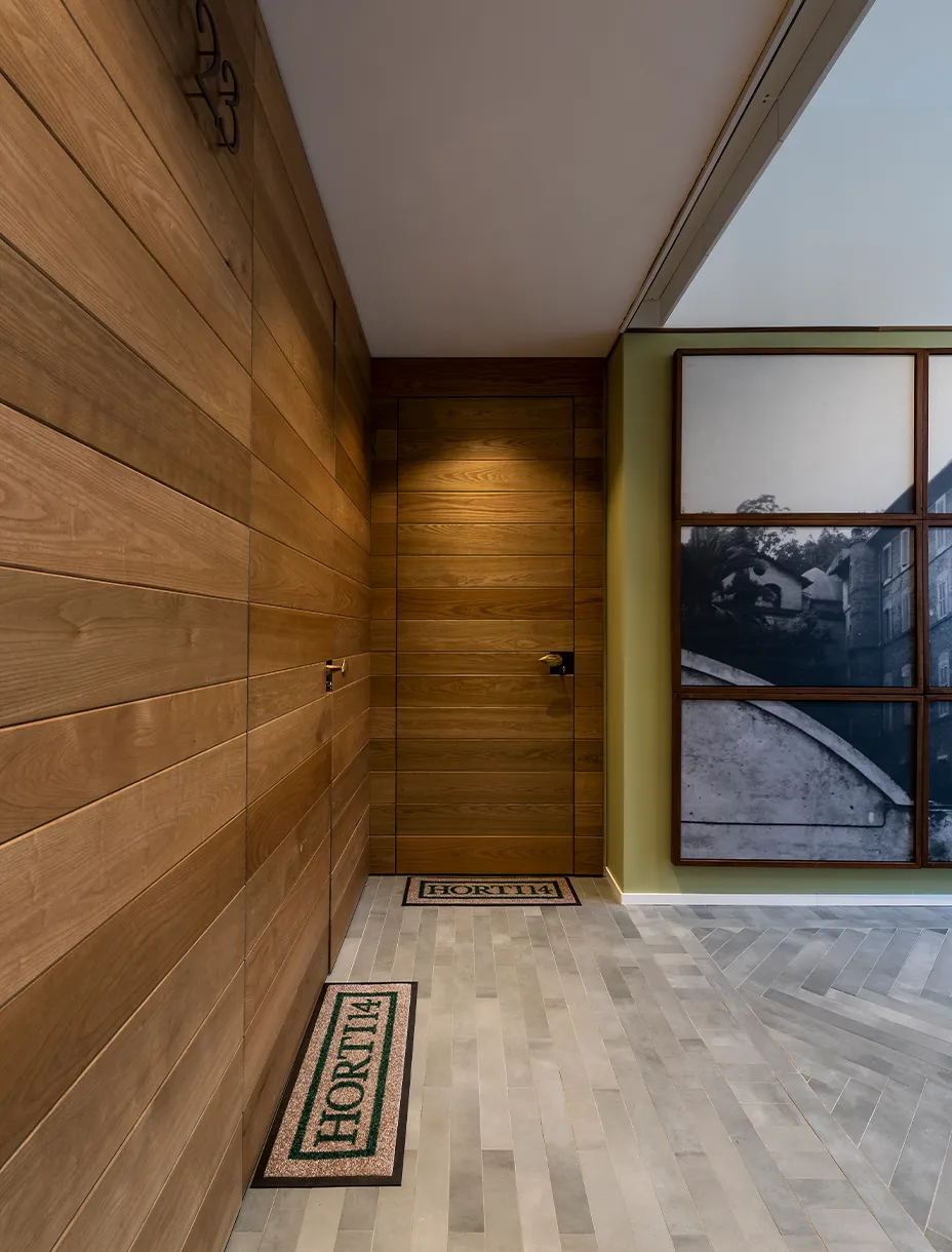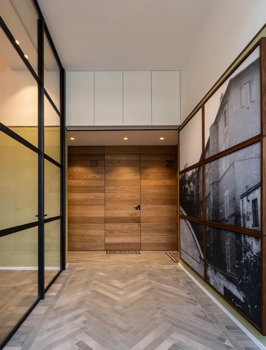 Le boiserie in legno, le superfici e gli arredi diventano parte integrante del linguaggio architettonico: materiali nobili come il noce e il frassino vengono esaltati nella loro purezza materica, nella capacità di restituire calore, profondità e autenticità. Un esempio di falegnameria artigianale di alta qualità che rende gli spazi accoglienti ed eleganti.