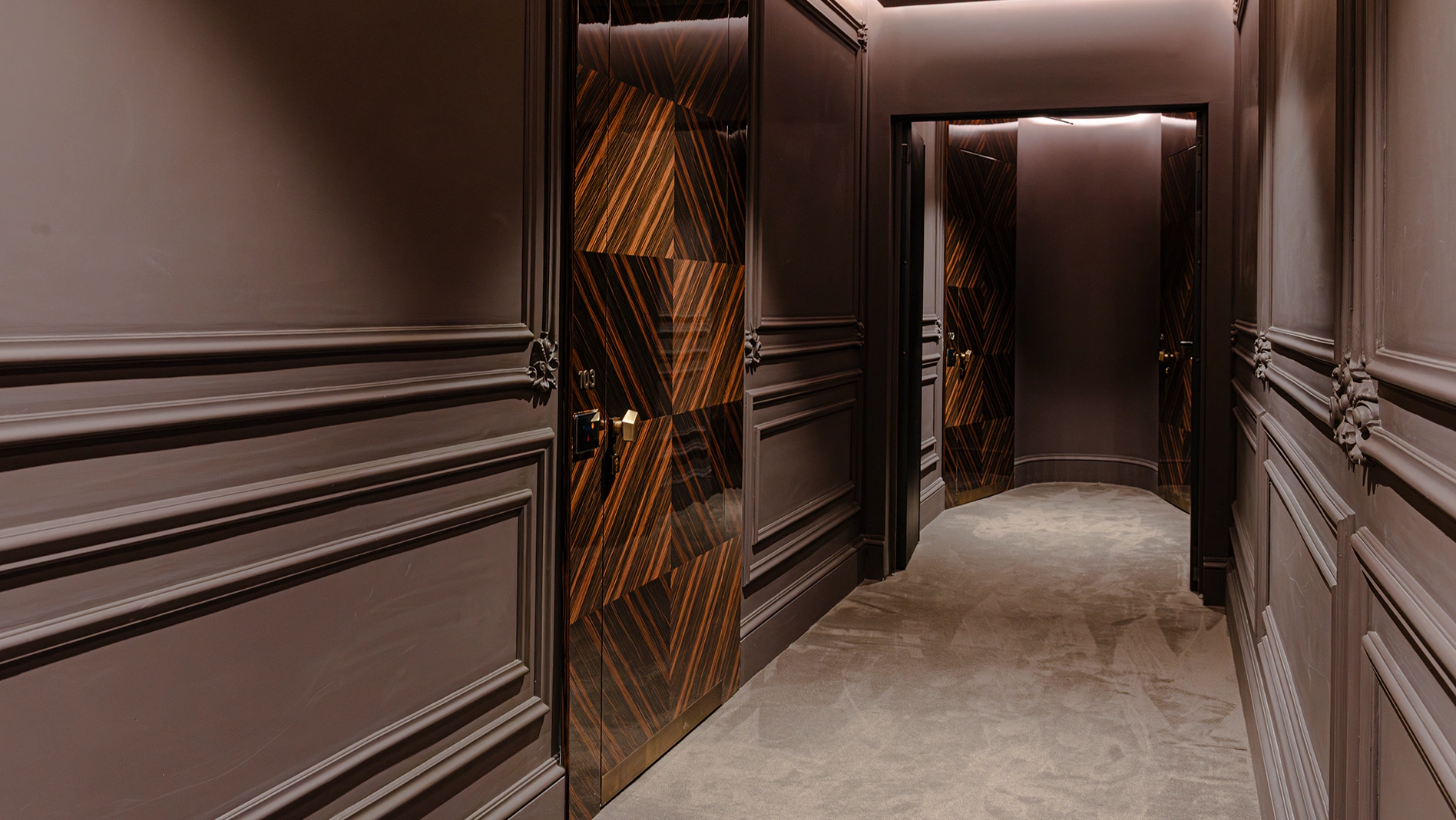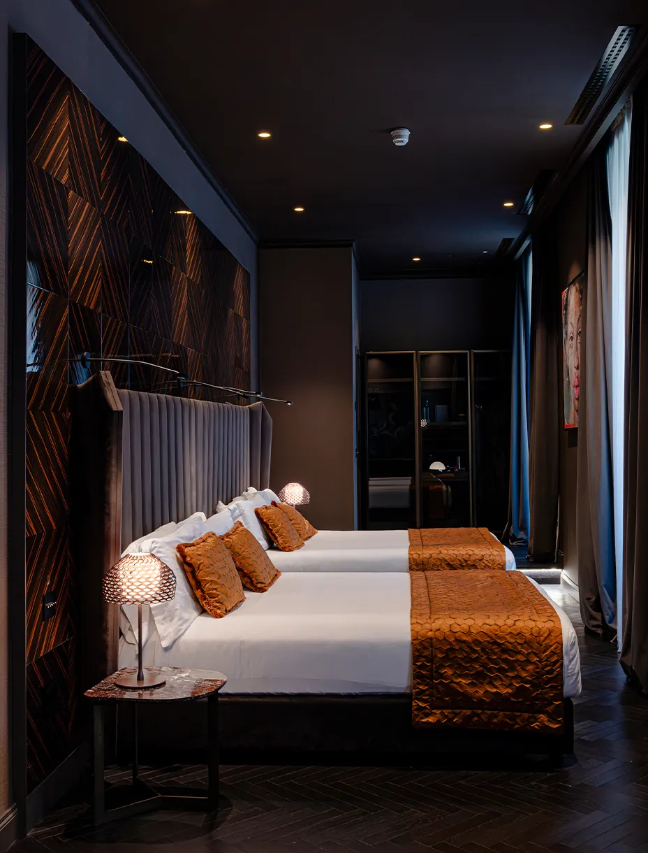 Questa forza materica dialoga con colori audaci e vibranti, capaci di dare ritmo e dinamismo agli ambienti, e con tessuti pregiati che avvolgono lo spazio. Boiserie e arredi su misura creano continuità tra hall, lounge e stanze, generando un percorso armonico e senza interruzioni. Ogni dettaglio concorre a definire un’atmosfera calda, accogliente e sofisticata.